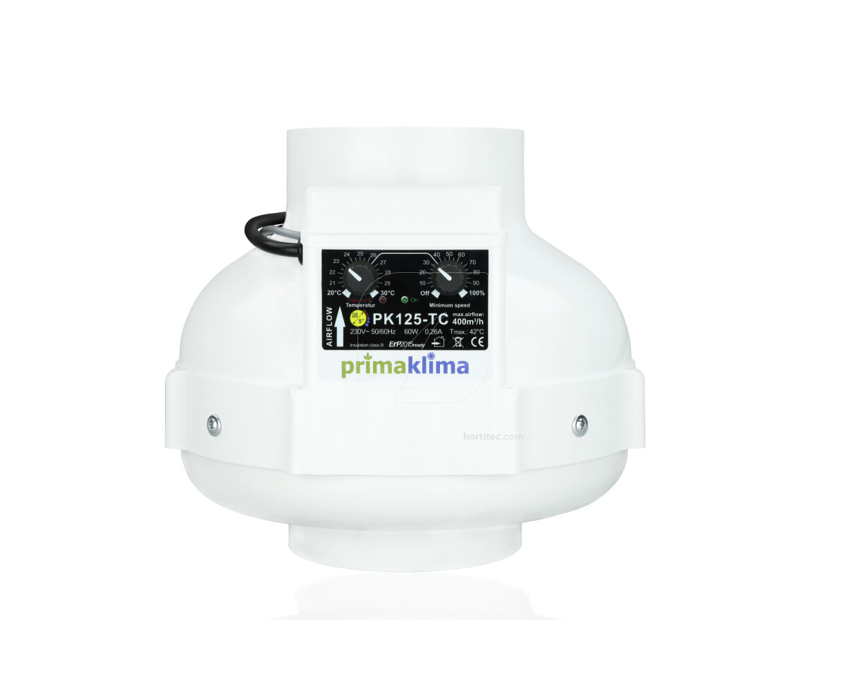 El Prima Klima PK125-TC es un ventilador de conductos en línea de alta eficiencia con control de temperatura, equipado con un motor centrífugo RadiCal de ebm-papst o un motor MES AC con palas curvadas hacia atrás que se ha adaptado de forma óptima a la carcasa. El dispositivo es extremadamente silencioso cuando se conecta a baja velocidad. Toda la carcasa está fabricada en poliamida (nylon) de alta resistencia a los impactos y a las llamas. Los rodamientos de bolas de larga duración, que no requieren mantenimiento, contribuyen a que el motor funcione con especial suavidad. El sistema de control, las conexiones y el condensador están totalmente integrados en la carcasa.