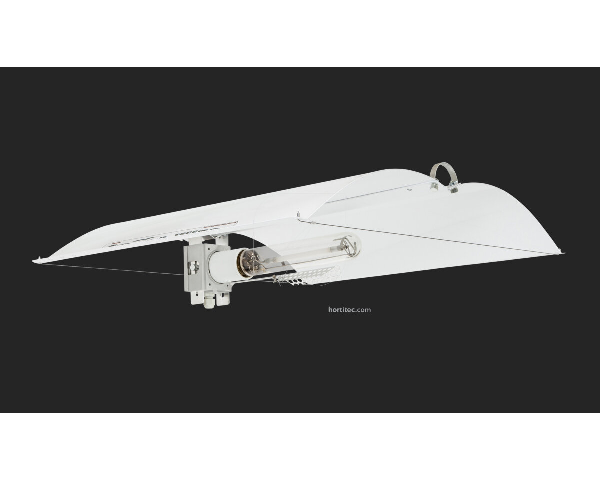 Este reflector ajustable permite a los cultivadores crear condiciones ideales de luz en todos los estados fenológicos de la planta, incrementando la vitalidad, sanidad, cosecha y potencia. Se puede ajustar la apertura de la s alas para así aumentar la superficie de alcance de la luz y poder acercar más la lámpara a las plantas, mejorando su rendimiento. También se pueden ajustar más cerrados y colocar el reflector proporcionalmente más lejos de la s plantas a cultivar, para así proporcionar la luz y calor en consonancia con las necesidades de plantas más sensibles.