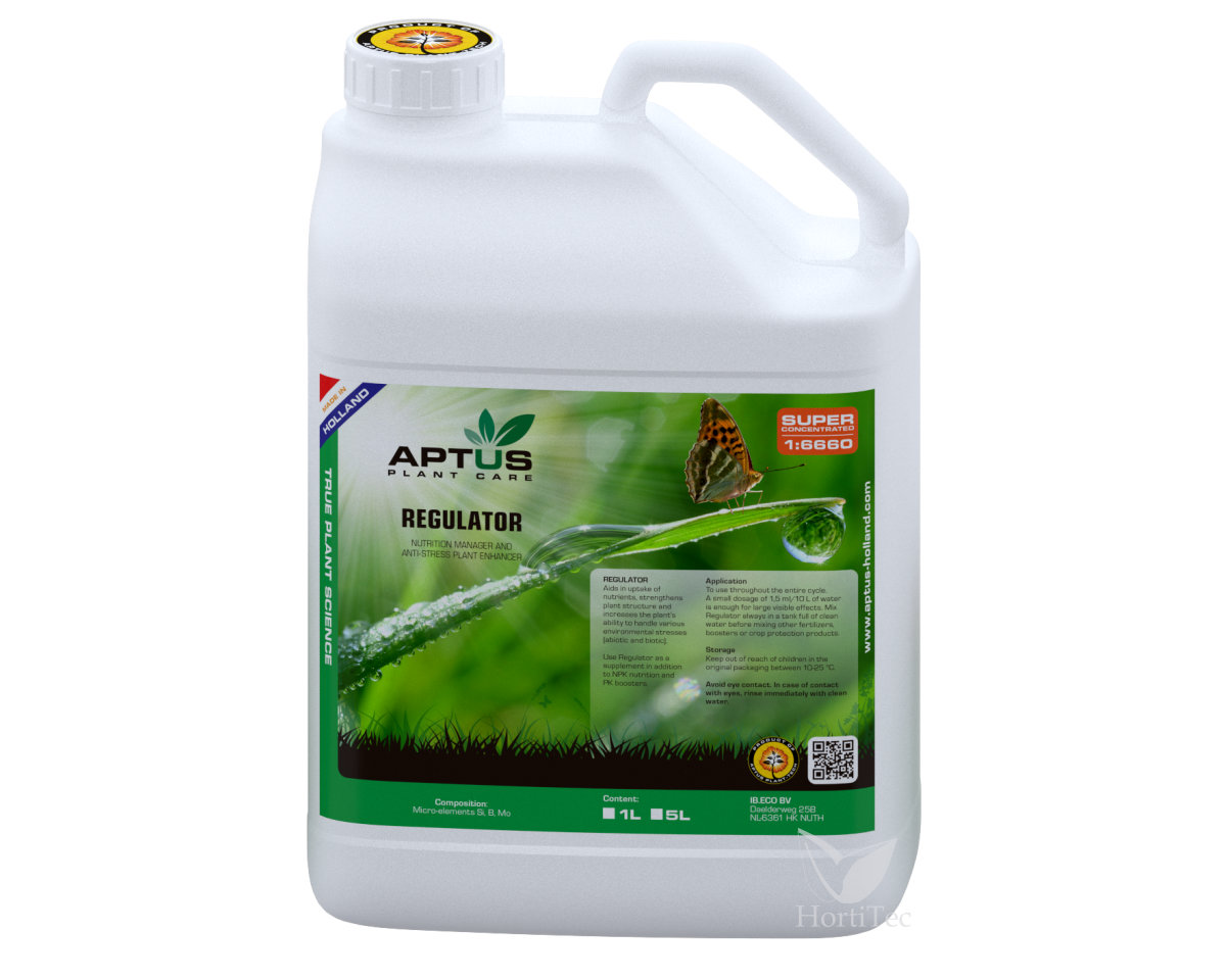 Regulator regula la absorción de nutrientes, reduciendo así los efectos negativos que produce tener una deficiencia o exceso de los mismos. Se utiliza durante todo el ciclo de cultivo a razón de 1,5 ml por cada 10 litros de agua, es decir, la botella de 100 ml sirve para preparar 650 litros de agua de riego.