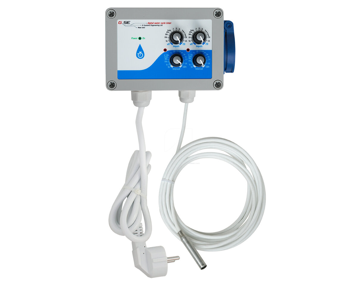 Controlador de riego de 10 A de GSE diseñado para automatizar el riego del cultivo. Dispone de un sensor de luz incorporado para diferenciar el riego nocturno del diurno. Carcasa resistente al agua, permite programar por separado el tiempo de riego así como el intervalo entre riegos y definirlos separadamente cuando la bombilla está encendida o apagada.